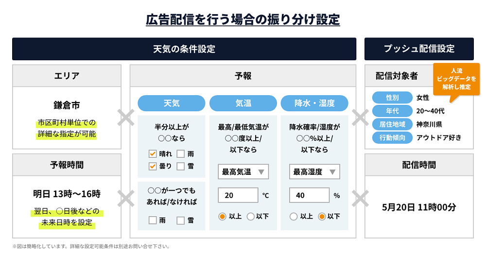 「天気プッシュ」は、天気/気温/降水・湿度といった気象データに時間やエリアの条件、そして人流データから推定されたユーザーの属性や自社アプリのデータごとにコンテンツの振り分け設定が可能なプッシュ配信サービスです。