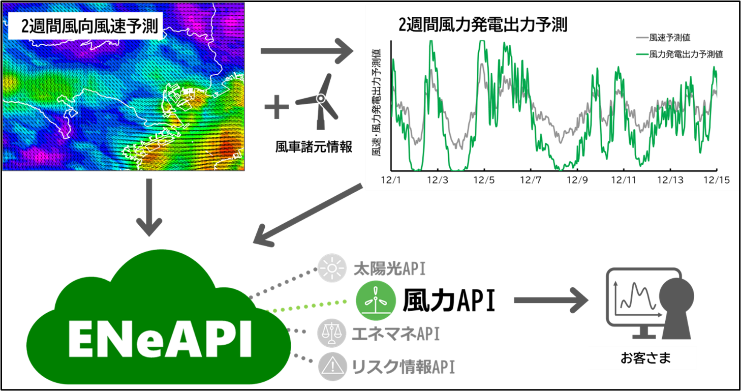 さらに、新たに提供を開始する「2週間風力発電出力予測API」では、2週間風向風速予測の出力結果と風車諸元情報を組み合わせ、風車ハブ高さや発電特性を踏まえた風力発電出力予測値を出力します。これにより、風力発電事業者や小売電気事業者などによる電力の需給管理や、需給ひっ迫に備えた対応などに活用いただけます。